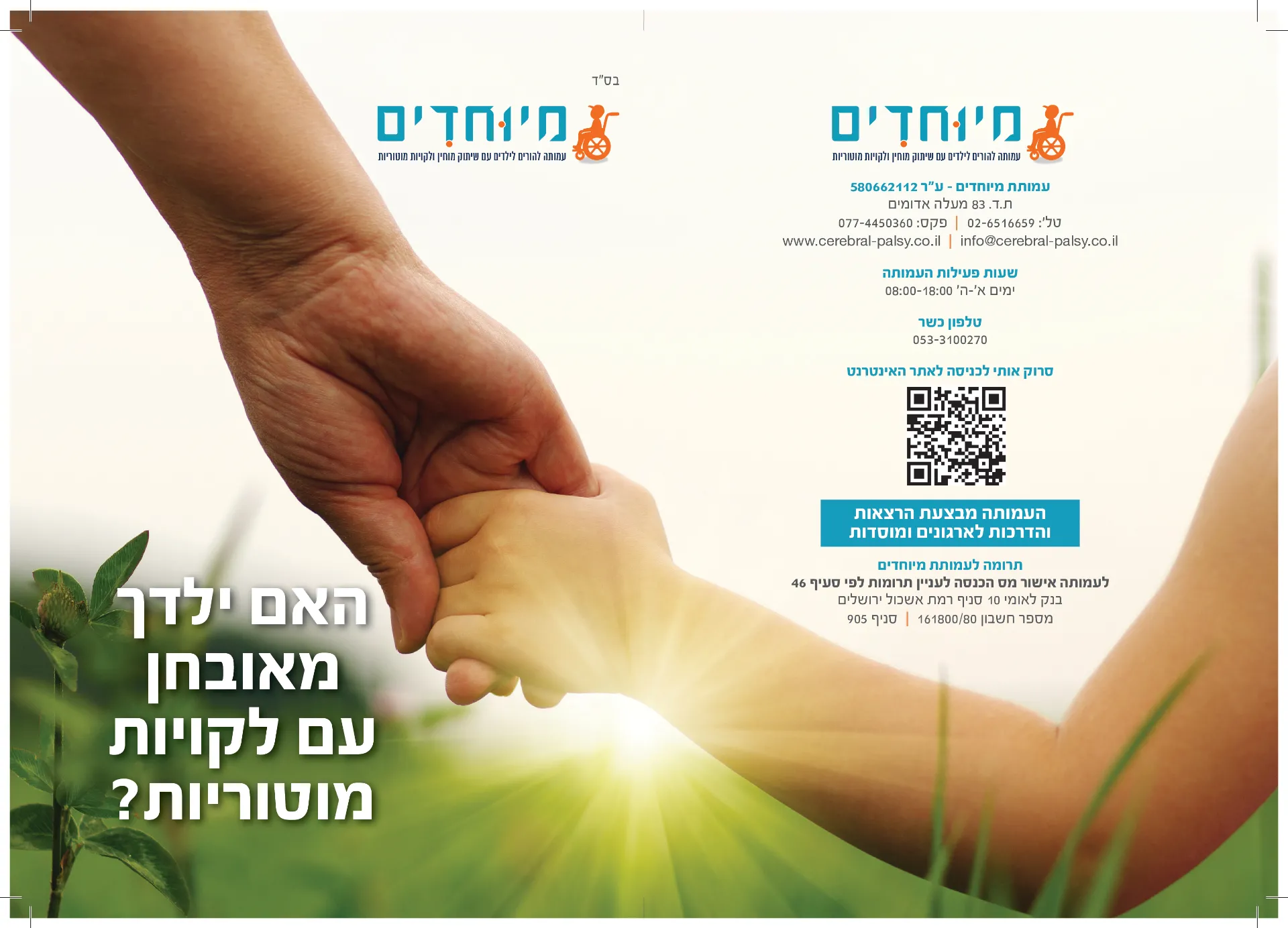 עמותת מיוחדים נוסדה בשנת 2018 על ידי קבוצת הורים אמיצה ומסורה לילדים עם שיתוק מוחין, שהחליטו לקחת אחריות וליצור שינוי אמיתי.