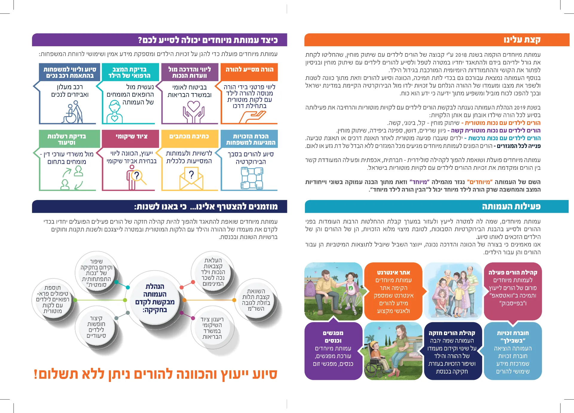 העמותה מספקת תמיכה, הדרכה והכוונה להורים מכל מגזר ומוצא, במטרה להעצים אותם, לייצג את זכויותיהם ולבנות קהילה חזקה שבה אף אחד לא מרגיש לבד.